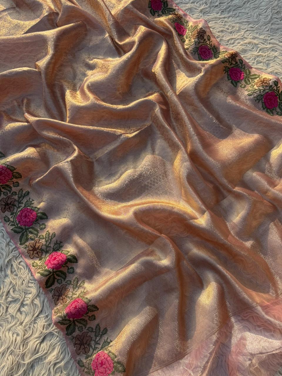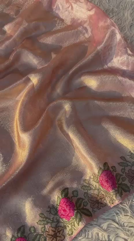 Authentic kanjivaram brocade tissue saree With Cross Stitch Embroidery