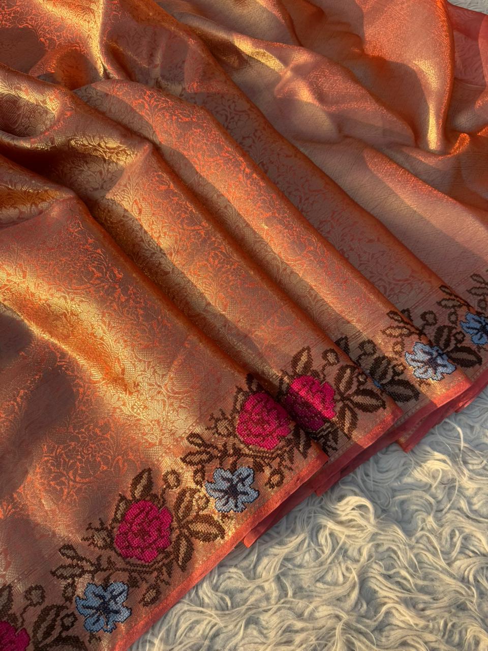 Authentic kanjivaram brocade tissue saree With Cross Stitch Embroidery