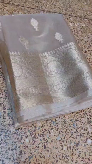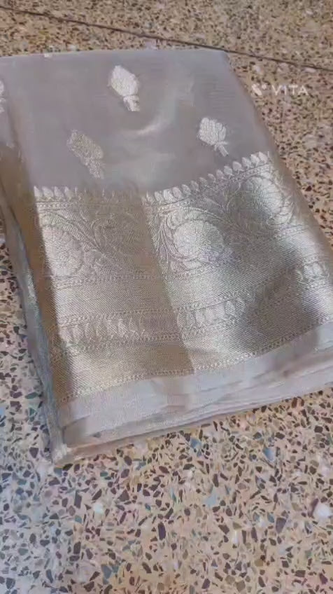 Banarasi Tissue Silk Saree With Zari Booti Weaving Designer Pallu