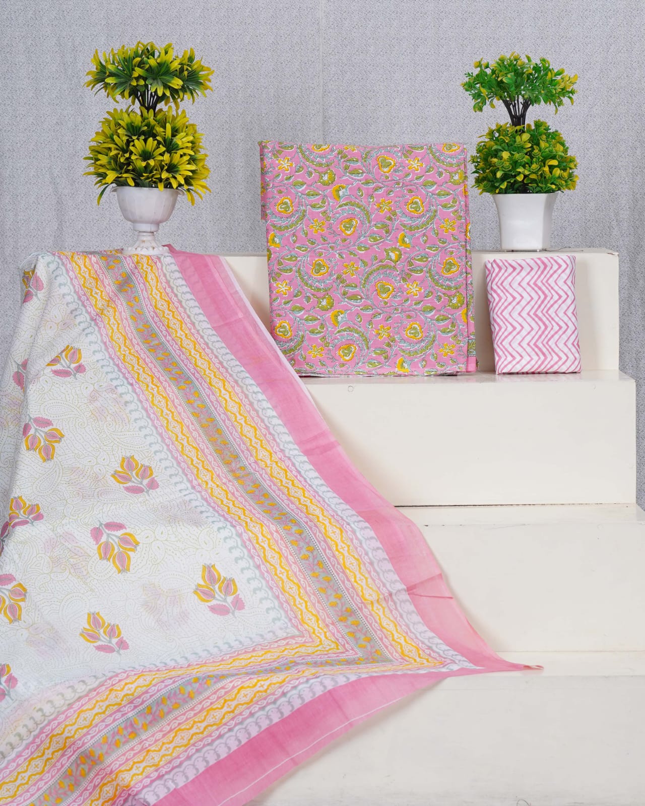 Pure Cotton Jaipuri Hand Block Print Unstitched Suit With Mul Cotton Dupatta.